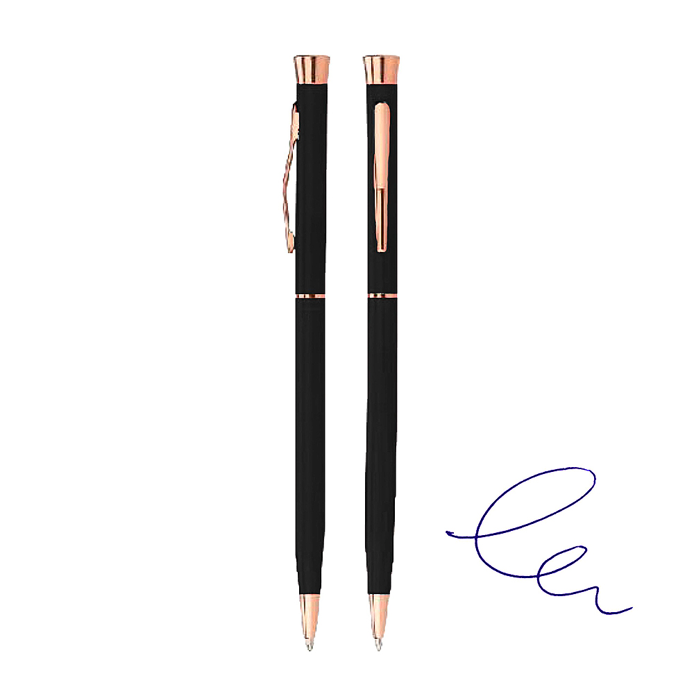 Bolígrafo metálico negro con detalles en cobre y tinta azul, ideal para regalos corporativos premium.