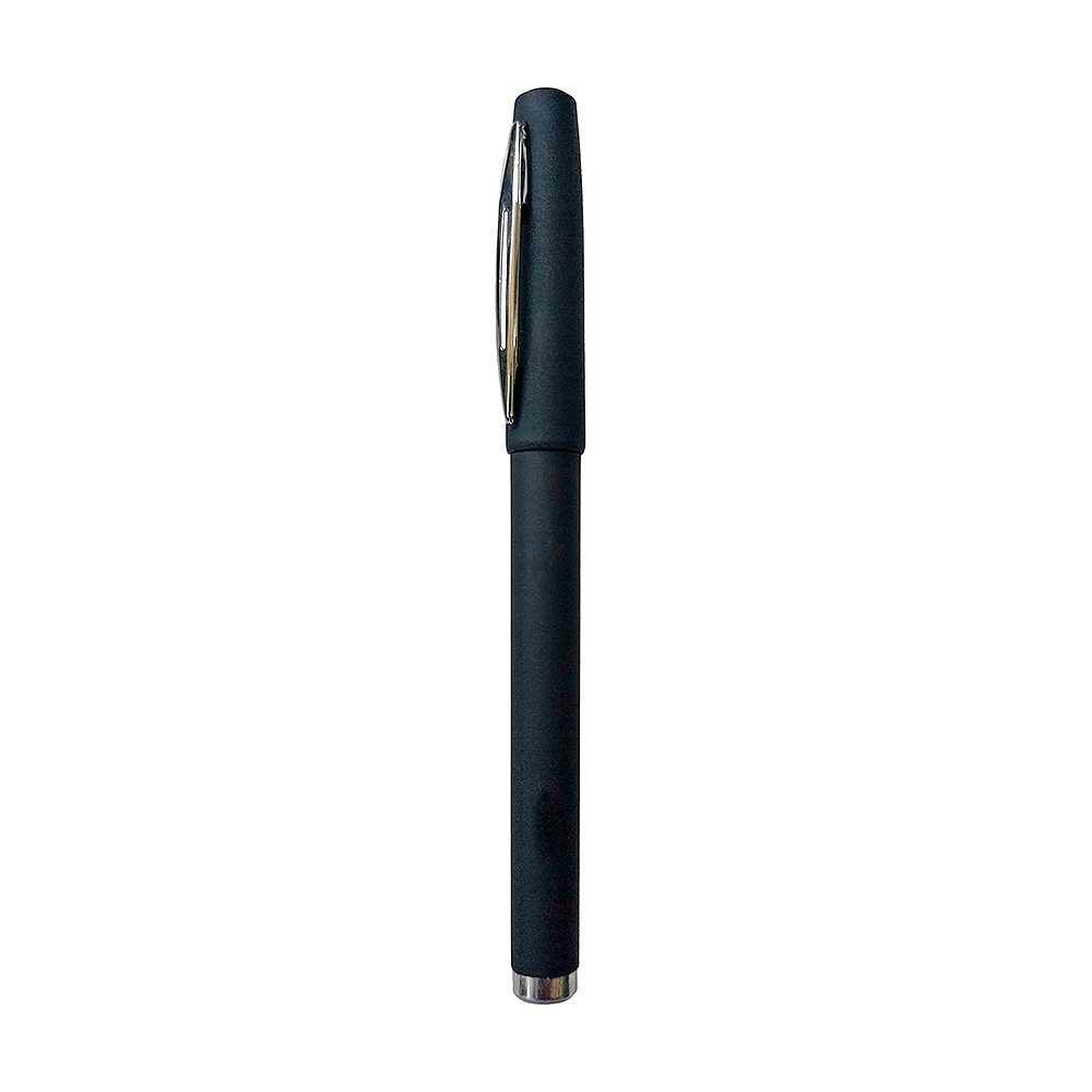 Bolígrafo plástico opaco con pulsador, clip metalizado y empuñadura ergonómica, ideal para uso corporativo.