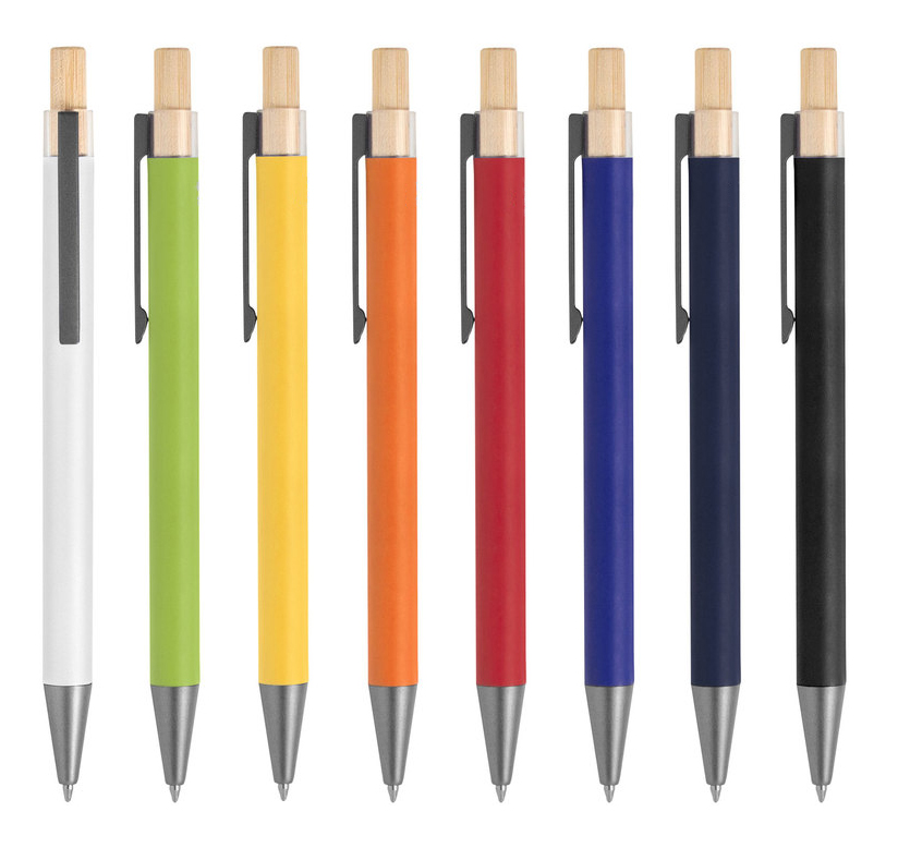 Bolígrafo retráctil. Cuerpo metálico en diferentes colores acabado mate. Clip metálico y puntera plástica color gris acabado mate. Pulsador de bambú.