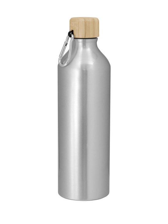 Botella de aluminio. Tapa a rosca de bambu con anillo de silicona y con mosquetón (gancho carabinero) en color plateado. Medidas: Ø 7,2 x 25,5 cm.