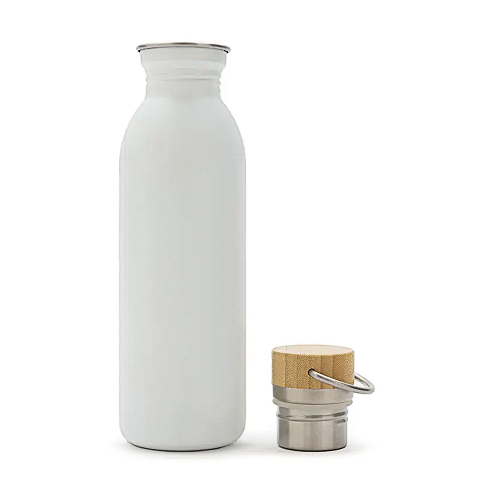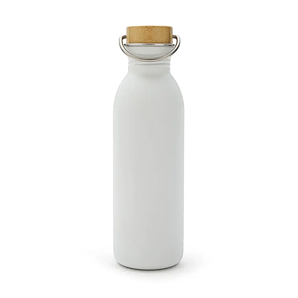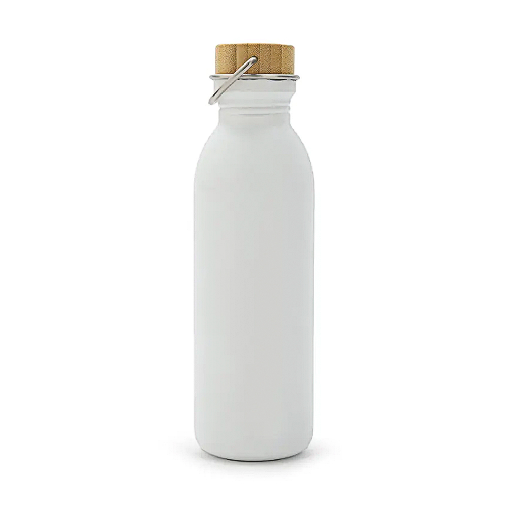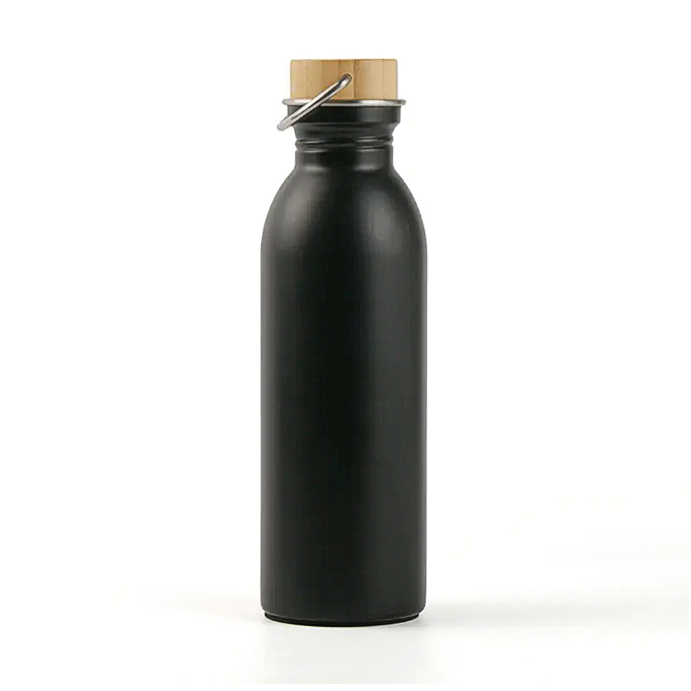 Botella metálica de diseño moderno y funcional, ideal para el uso diario y actividades deportivas. Incorpora una tapa de bambú natural que aporta un estilo elegante y sustentable, junto con una manija de agarre integrada que facilita su transporte durante entrenamientos, caminatas o desplazamientos urbanos.