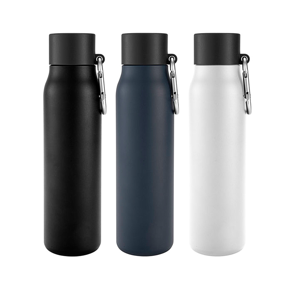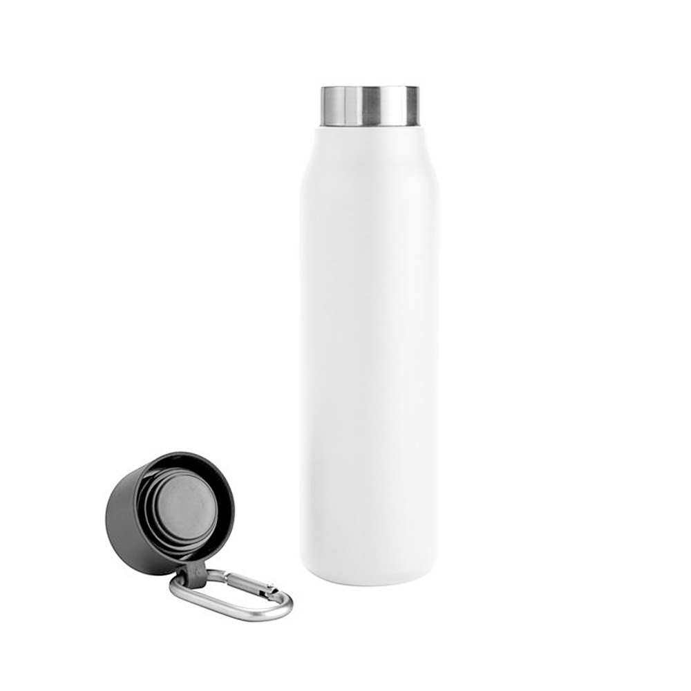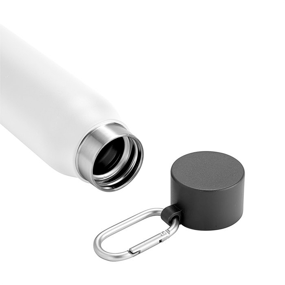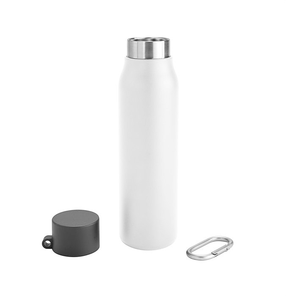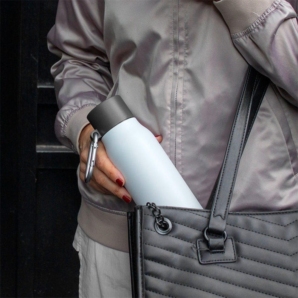 Está fabricada con interior de acero inoxidable 304 reciclado y exterior de acero 201, combinando resistencia, durabilidad y compromiso ambiental. Su terminación en pintura powder coat ofrece mayor protección contra la corrosión y el desgaste, asegurando una larga vida útil. Incluye tapa de polipropileno, anillo de silicona y mosquetón de aluminio, facilitando su transporte. Se presenta en caja de regalo Kraft, ideal para regalos corporativos con enfoque ecológico.