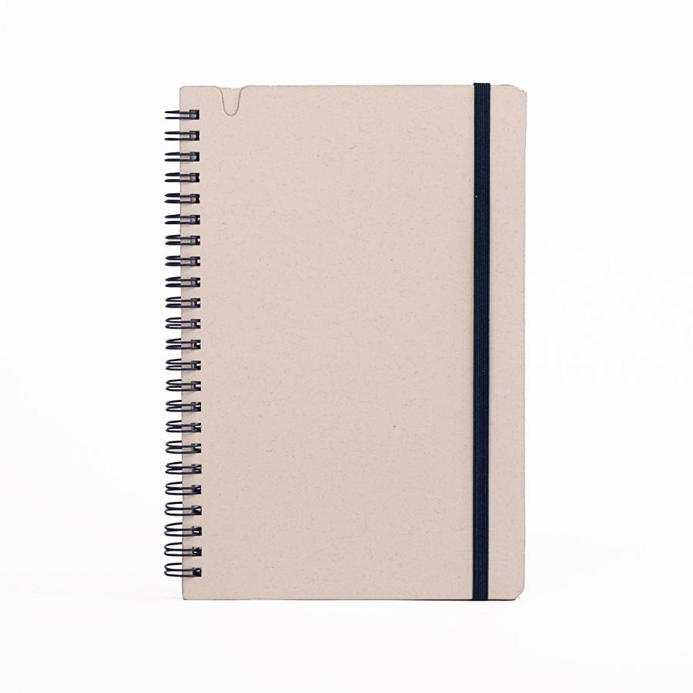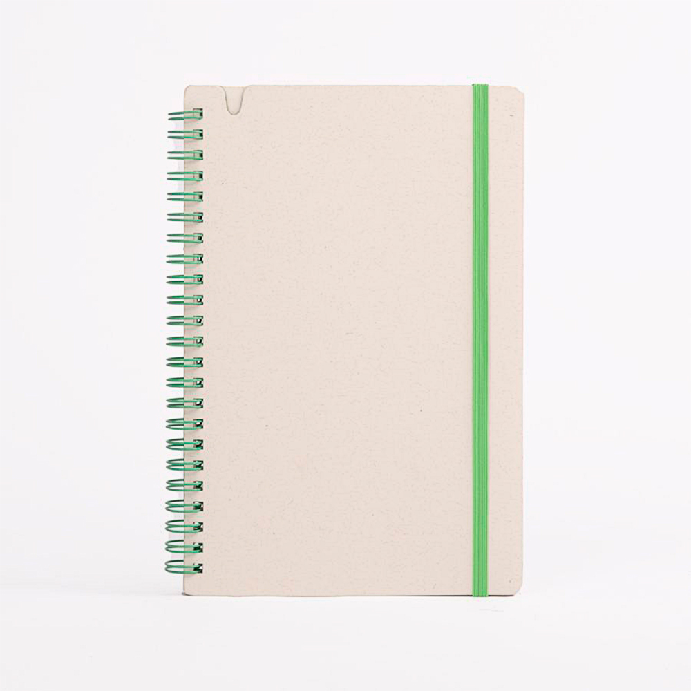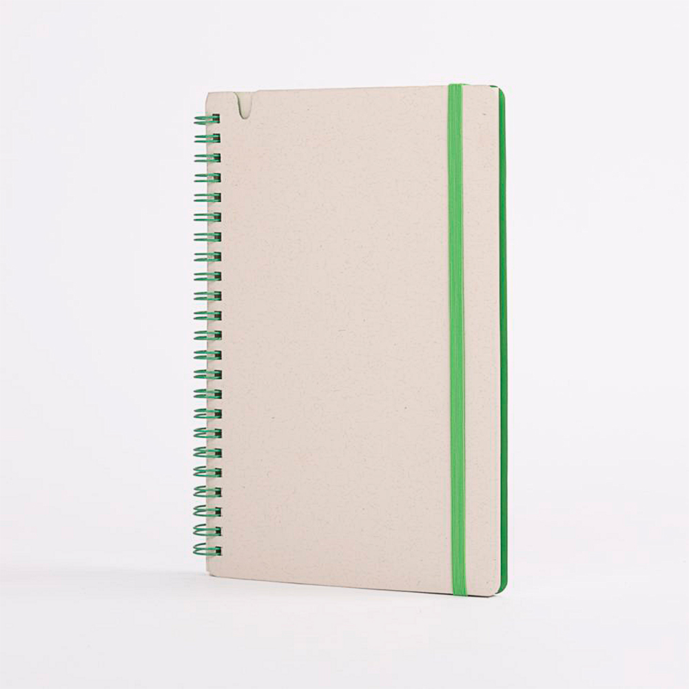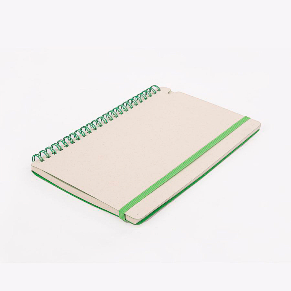 Cuenta con 70 hojas de papel blanco con leve tono gris, que mantienen la identidad natural del material reciclado. Su espiral lateral y banda elástica en color verde refuerzan visualmente su carácter ecológico y aportan practicidad para el uso cotidiano en oficinas, capacitaciones o actividades académicas. OSORNO es personalizable y perfecto para marcas comprometidas con hábitos responsables y economía circular.
