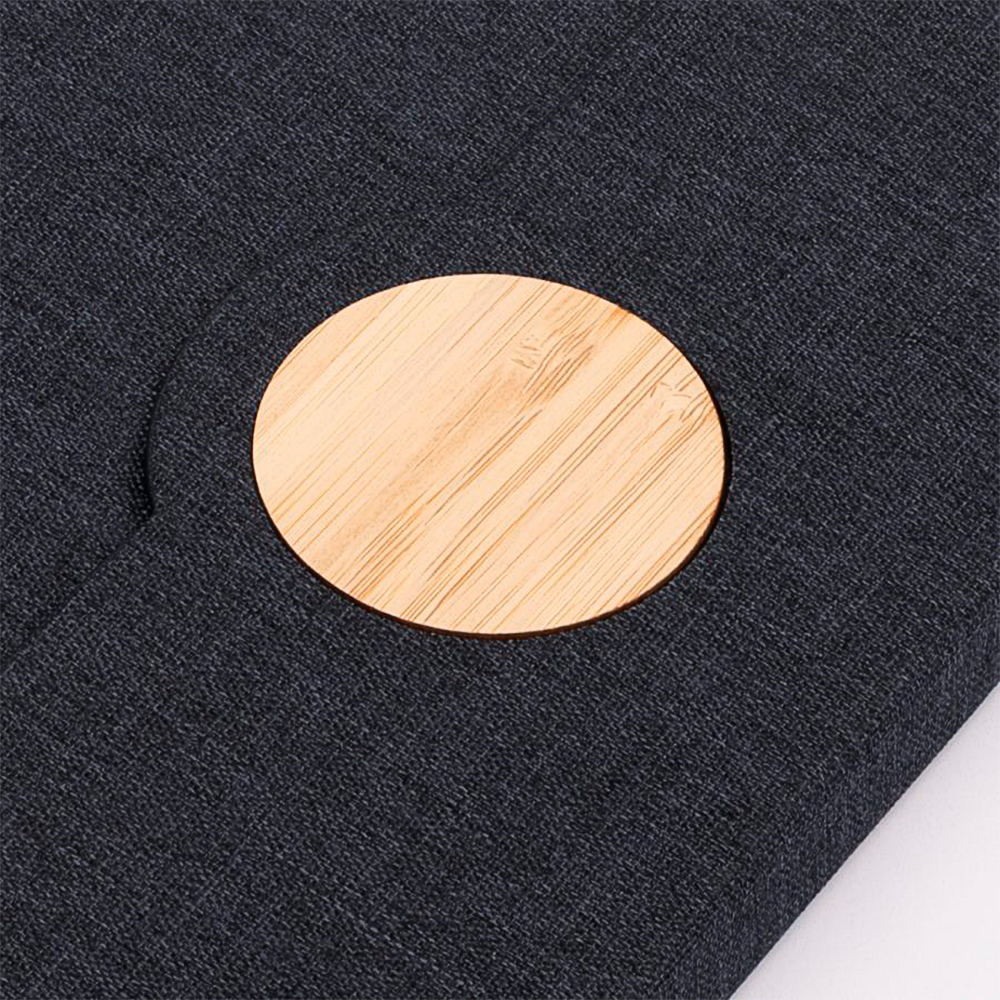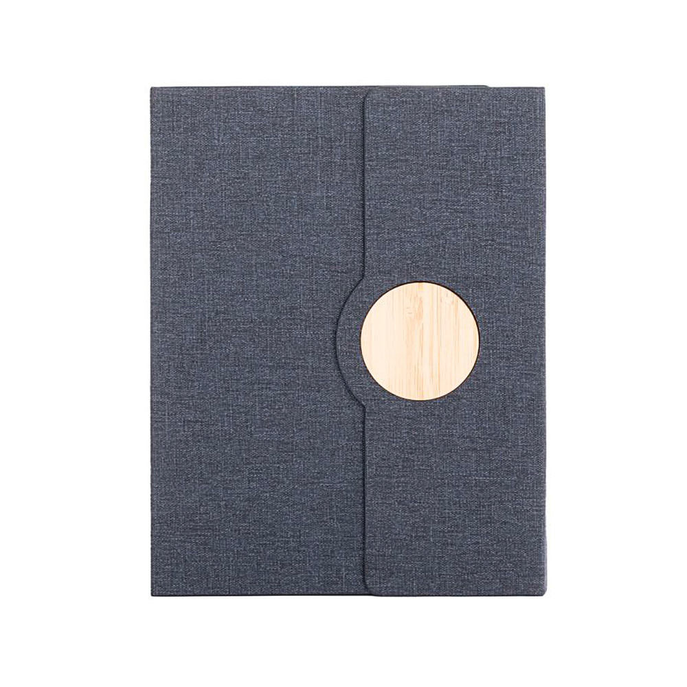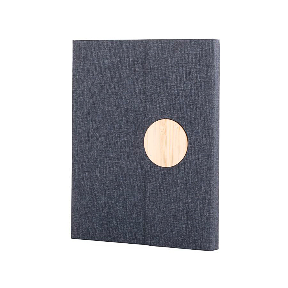 Combina elegancia moderna y compromiso ambiental, convirtiéndose en una excelente opción como regalo corporativo sustentable. Su cubierta de tela Oxford fabricada a partir de botellas plásticas recicladas (RPET) reduce el impacto ambiental, mientras que su cierre magnético con detalle de bambú natural aporta un toque sofisticado y distintivo, ideal para marcas que valoran el diseño consciente.