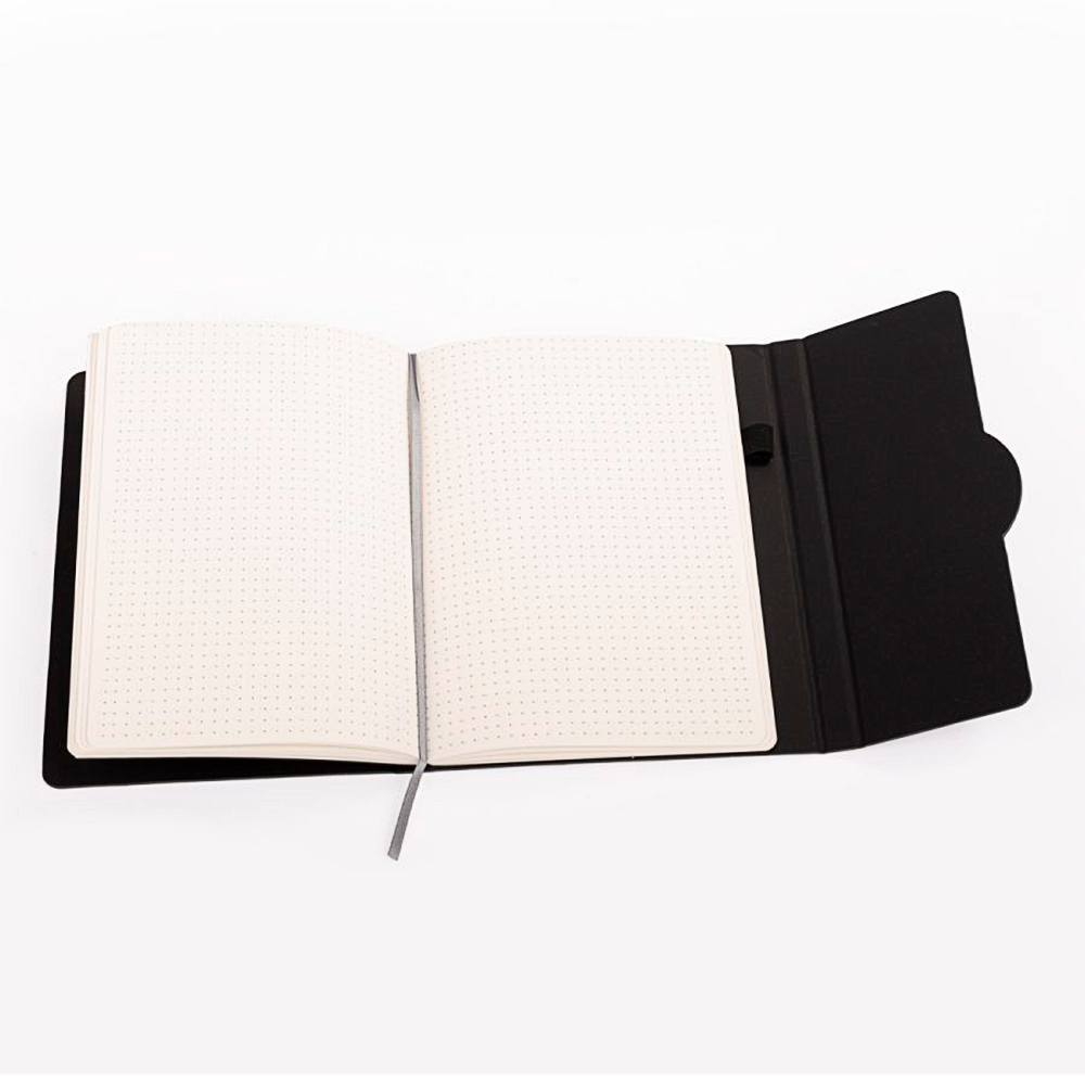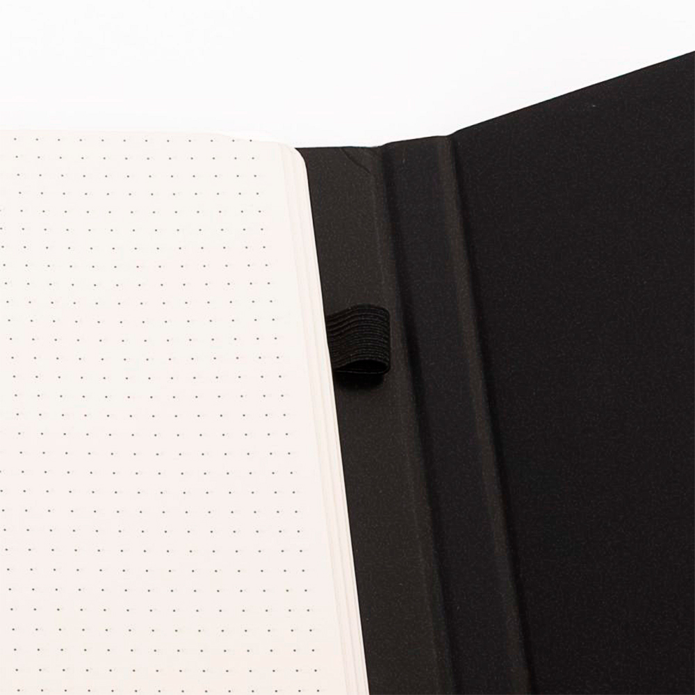 En su interior cuenta con 80 hojas punteadas de papel marfil de 70 g, perfectas para tomar notas, desarrollar ideas o realizar esquemas de forma ordenada. Incorpora cinta marcadora y soporte elástico para bolígrafo, mejorando la experiencia de uso diario en oficina, reuniones o espacios creativos. Disponible en gris o azul, TAHITI utiliza RPET con certificación GRS, garantizando procesos de reciclaje responsables y alineados con valores sostenibles.