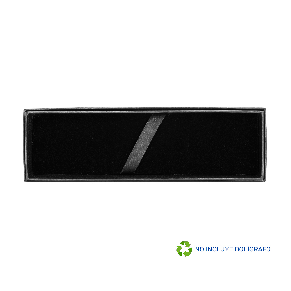 En su interior incorpora una base acolchada con tela negra afelpada que protege el bolígrafo y una cinta sujeta-bolígrafo de poliéster que lo mantiene firmemente en su lugar. Gracias a su diseño elegante y compacto, este estuche es ideal para complementar bolígrafos personalizados en regalos corporativos, reconocimientos o kits ejecutivos.