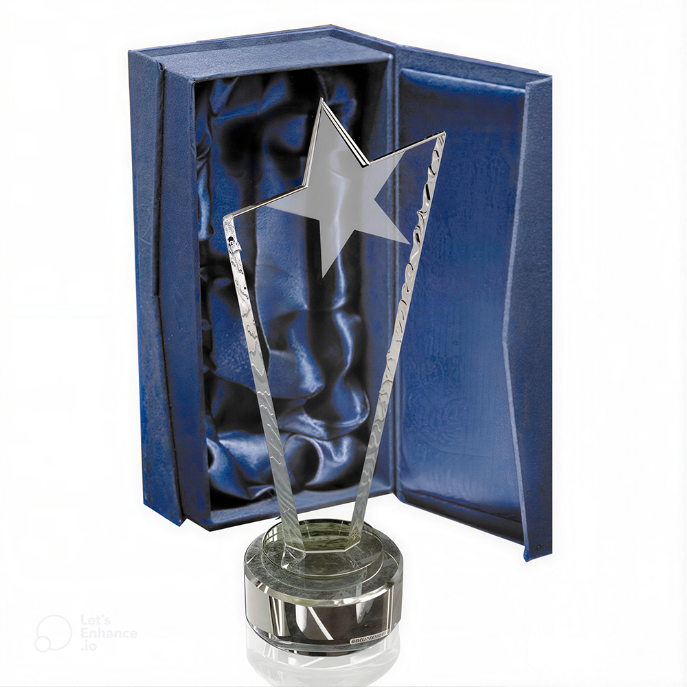 Reconocimiento corporativo elegante y simbólico, ideal para premiaciones, aniversarios empresariales y logros destacados. Fabricado en cristal de alta calidad, incorpora bordes biselados que realzan su brillo y una estrella grabada que aporta distinción y significado al reconocimiento.