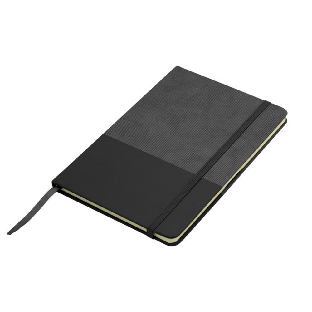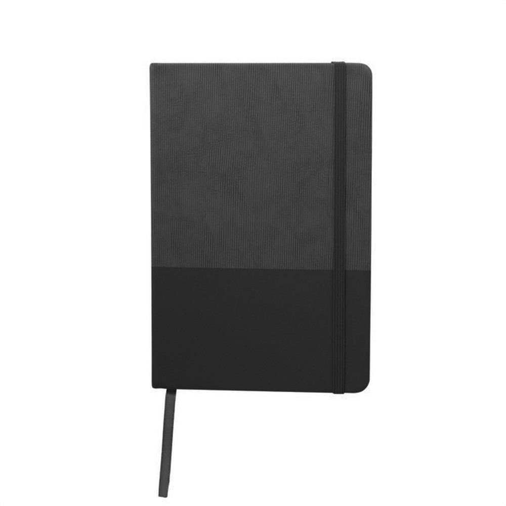 Libreta GAM corporativa con tapa de poliuretano bicolor, hojas rayadas y cierre elástico, ideal para regalos empresariales.