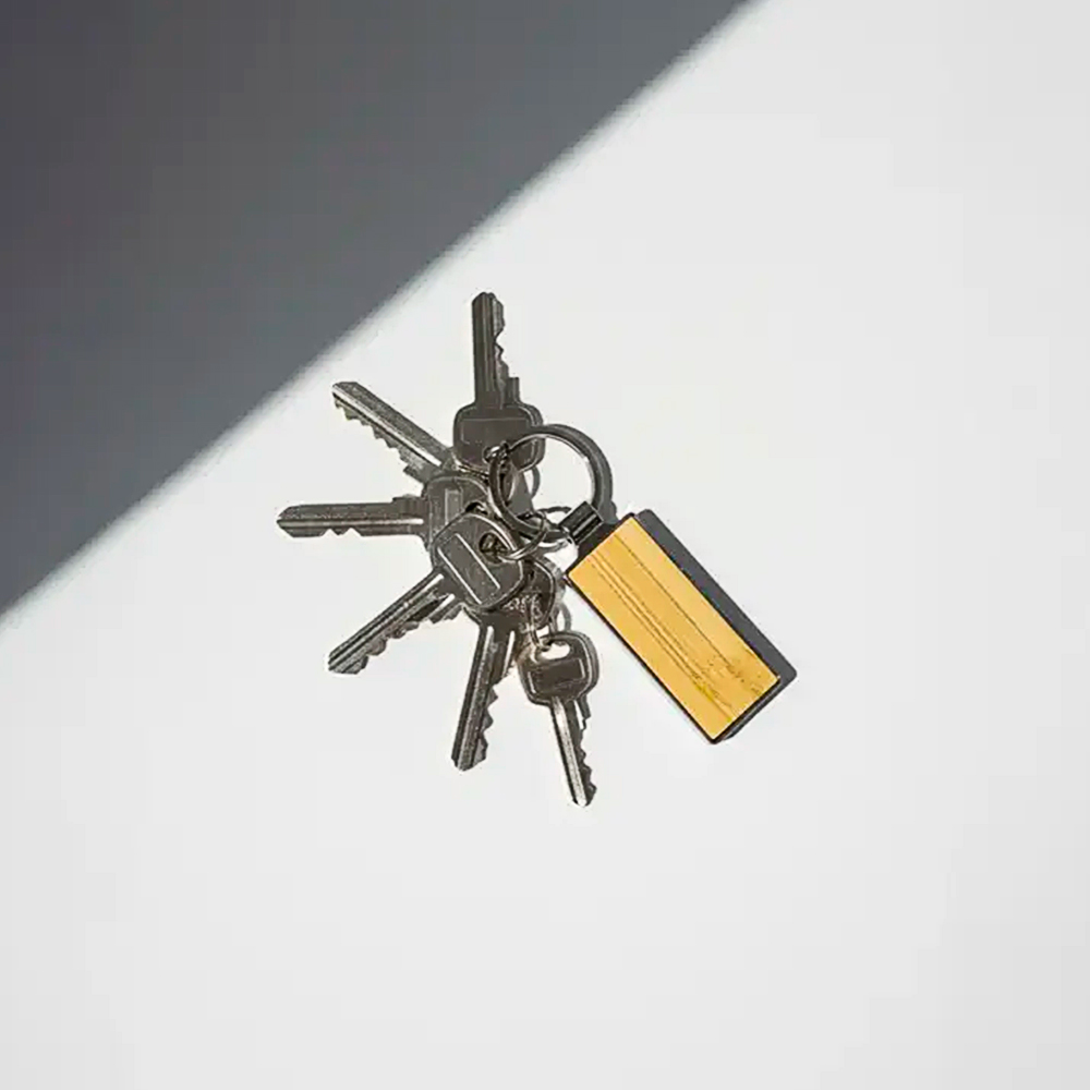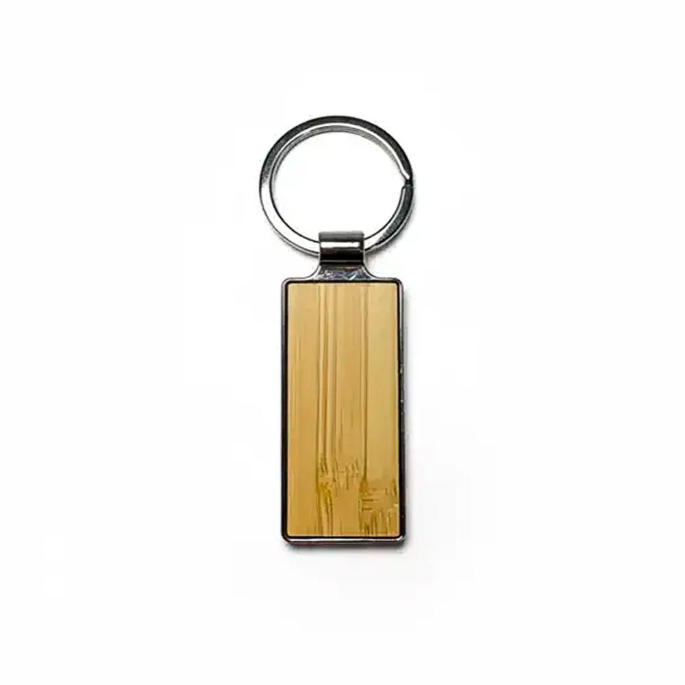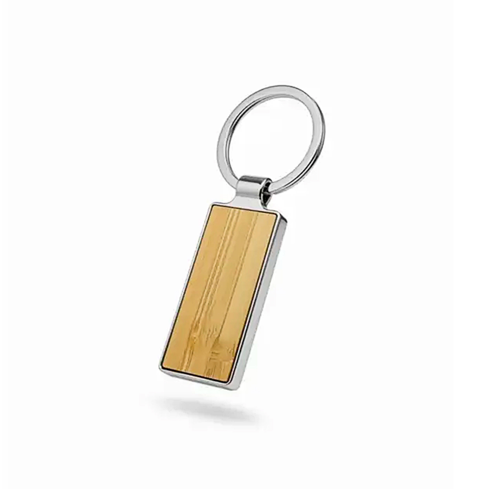 Llavero metálico con cara de bambú y diseño minimalista, ideal para regalos corporativos ecológicos y promocionales.