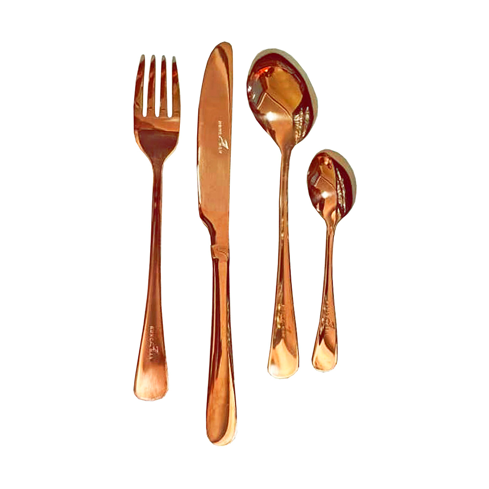 Set de cubiertos encobrizados de acero inoxidable, ideal como regalo corporativo premium elegante y funcional. Sugerencias de impresión: impresión digital UV y grabado laser.