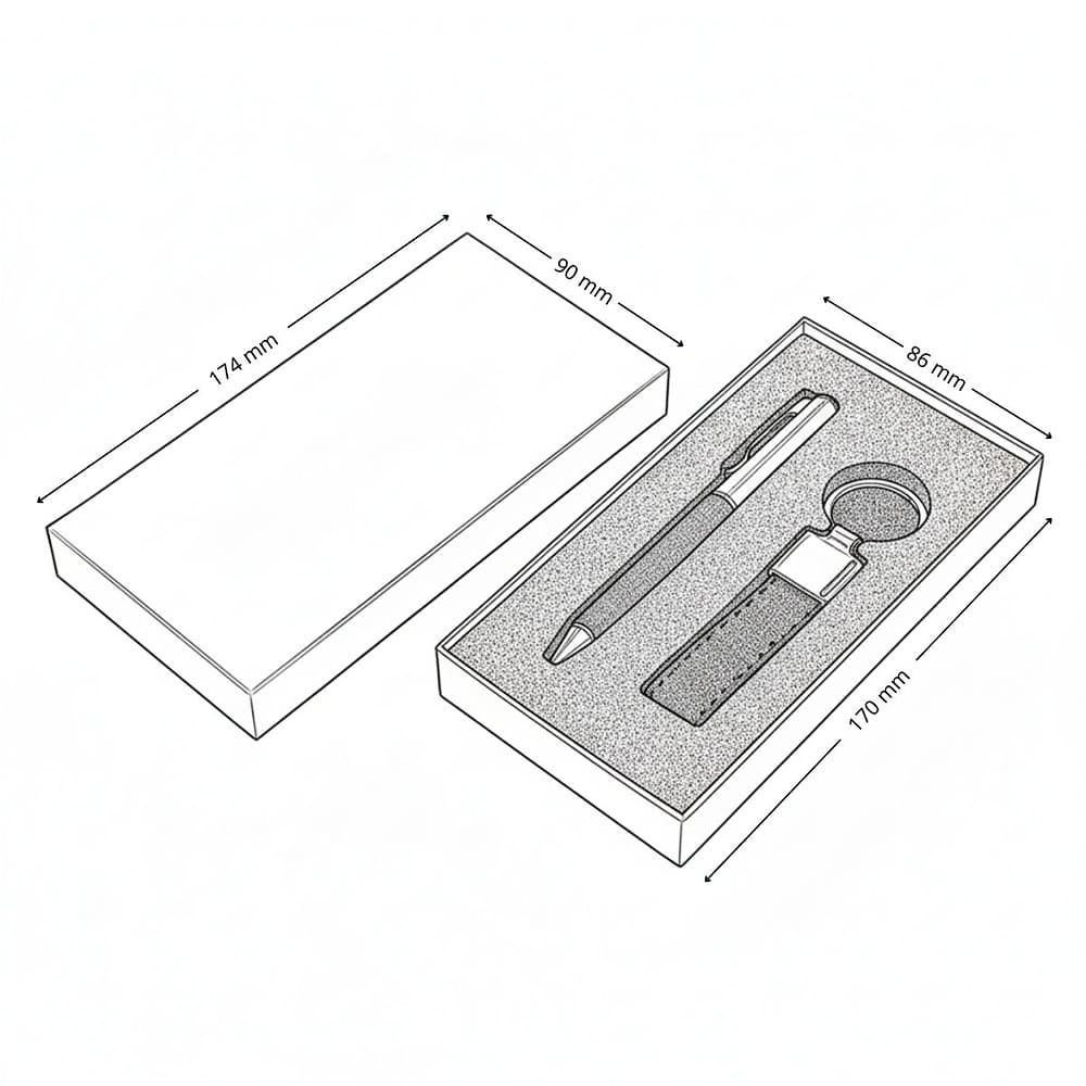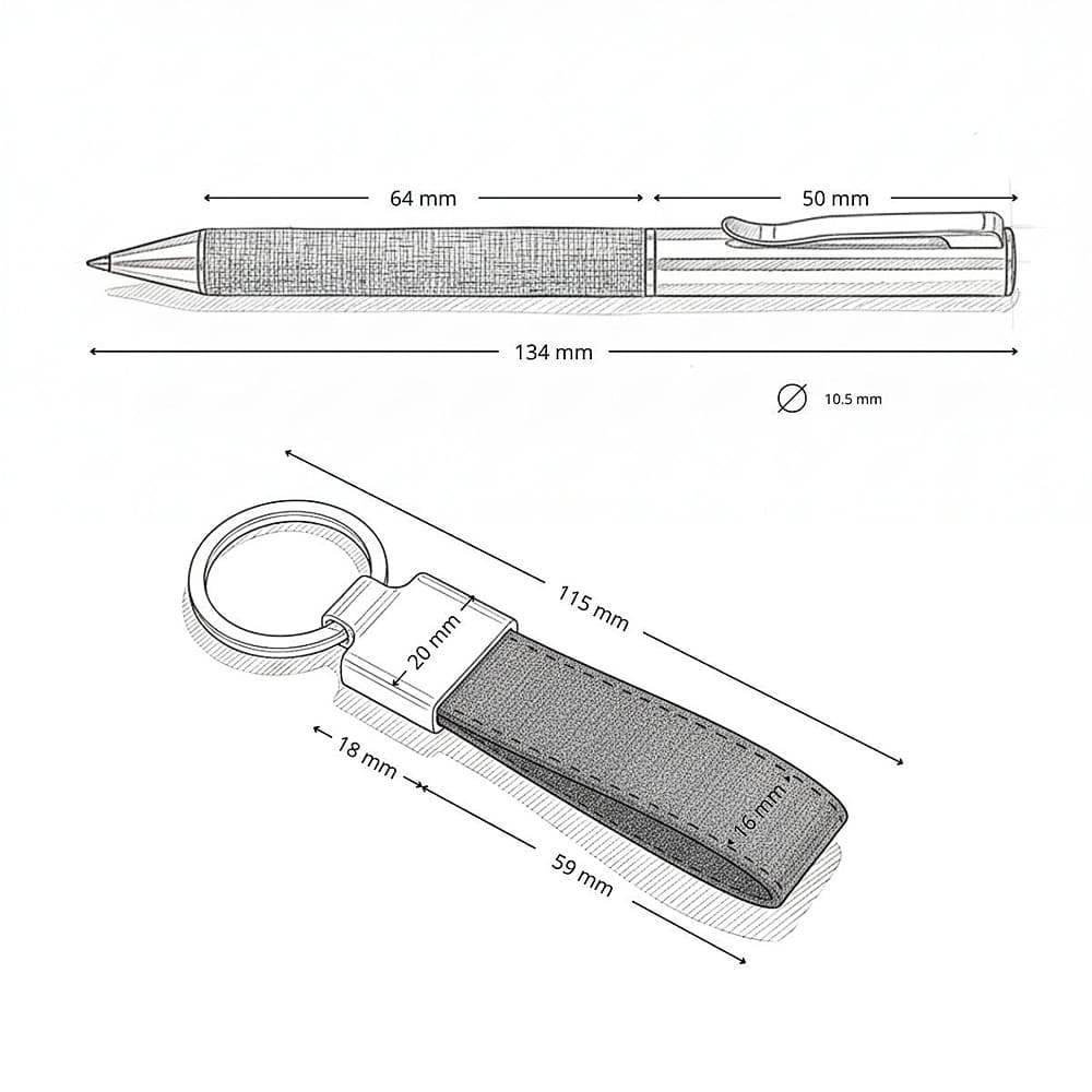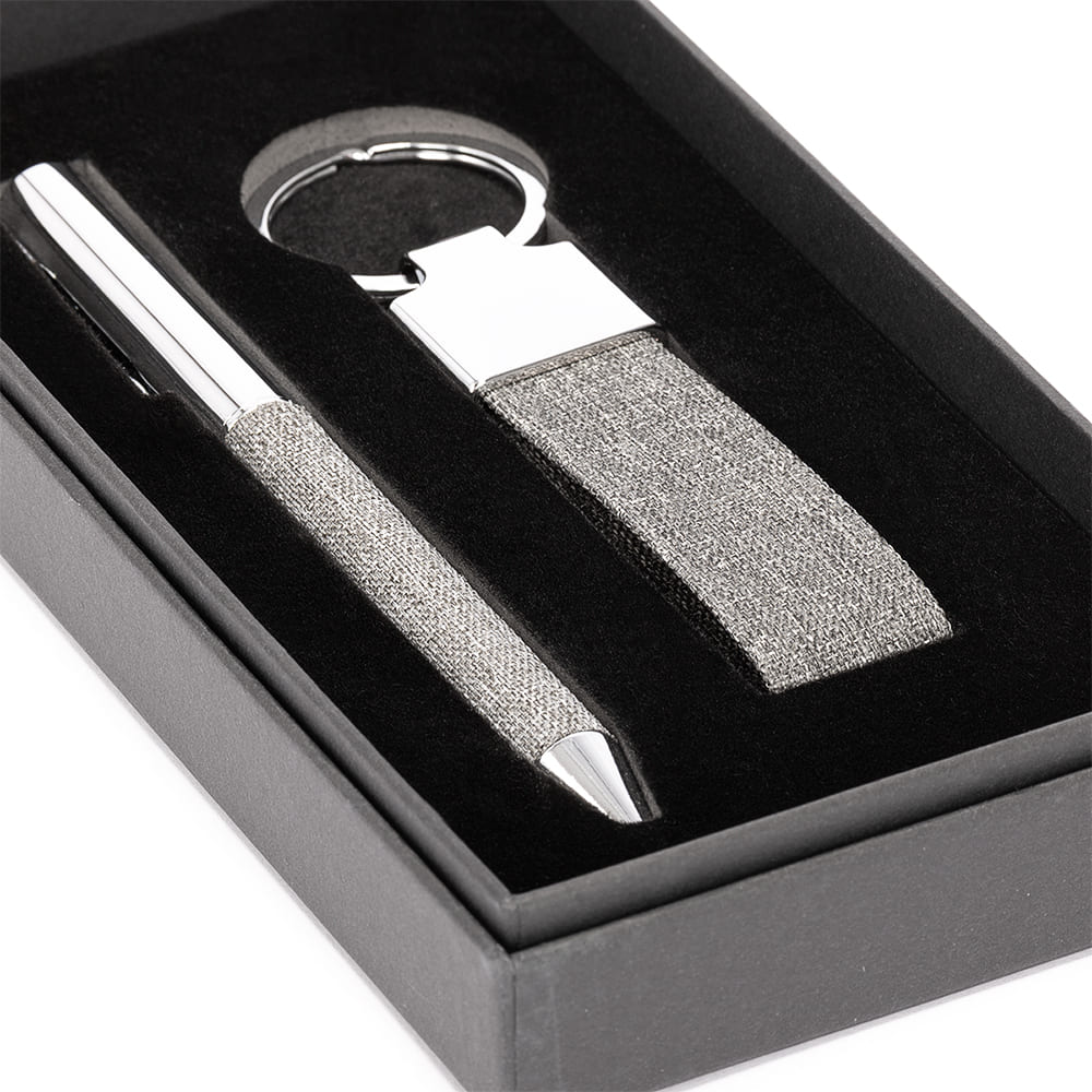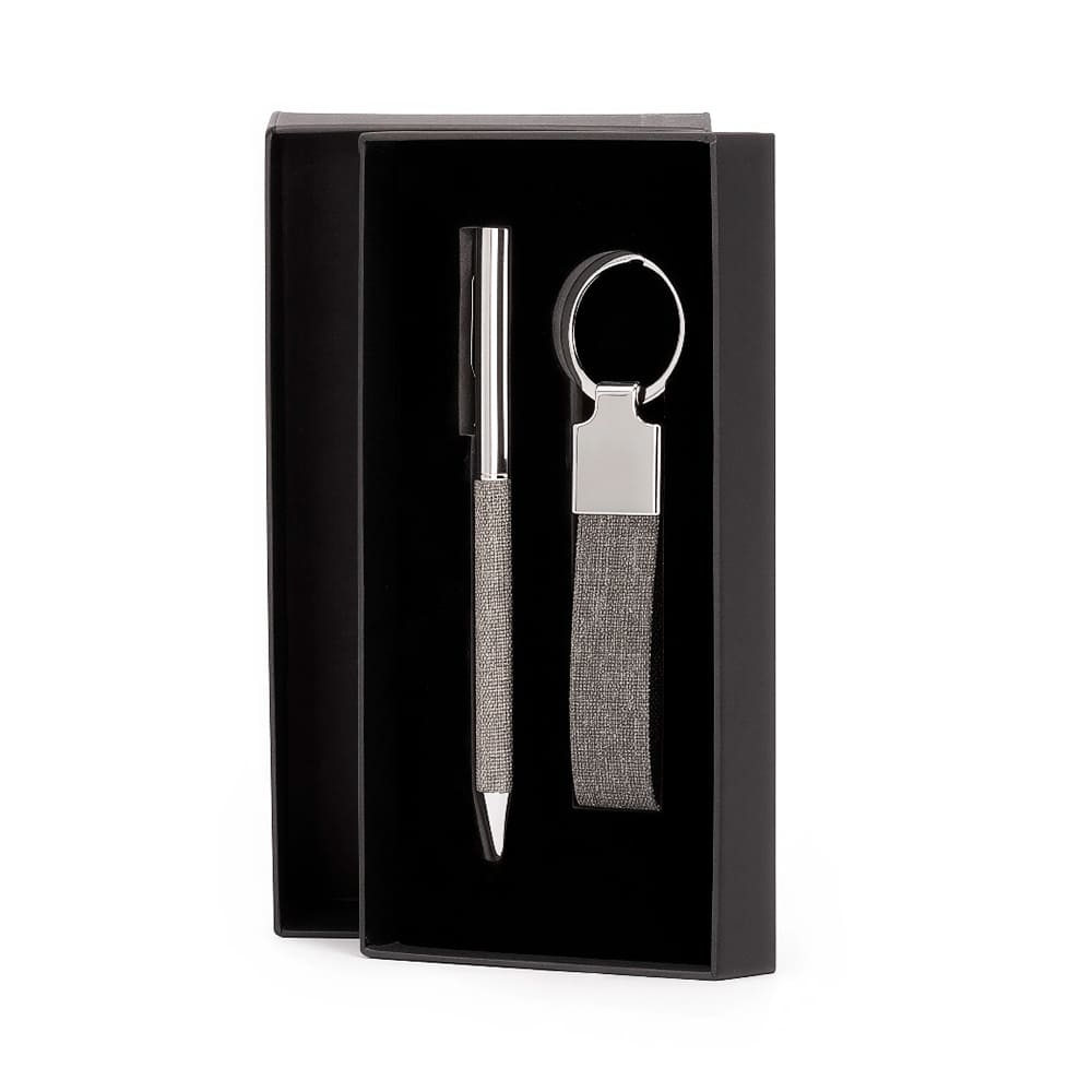 Práctico set corporativo compuesto por bolígrafo y llavero fabricados en RPET reciclado, material sustentable que contribuye a la reducción de residuos plásticos. Su diseño moderno en color gris (Grey) lo convierte en una alternativa versátil para campañas empresariales con enfoque ecológico.