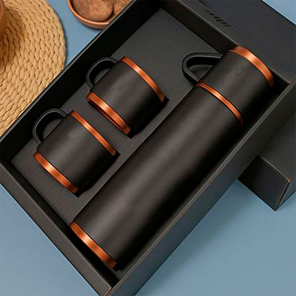 Termo de acero inoxidable negro de 500 ml con tazas, ideal como regalo corporativo práctico y elegante.