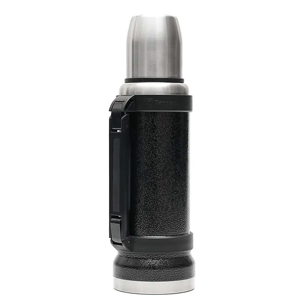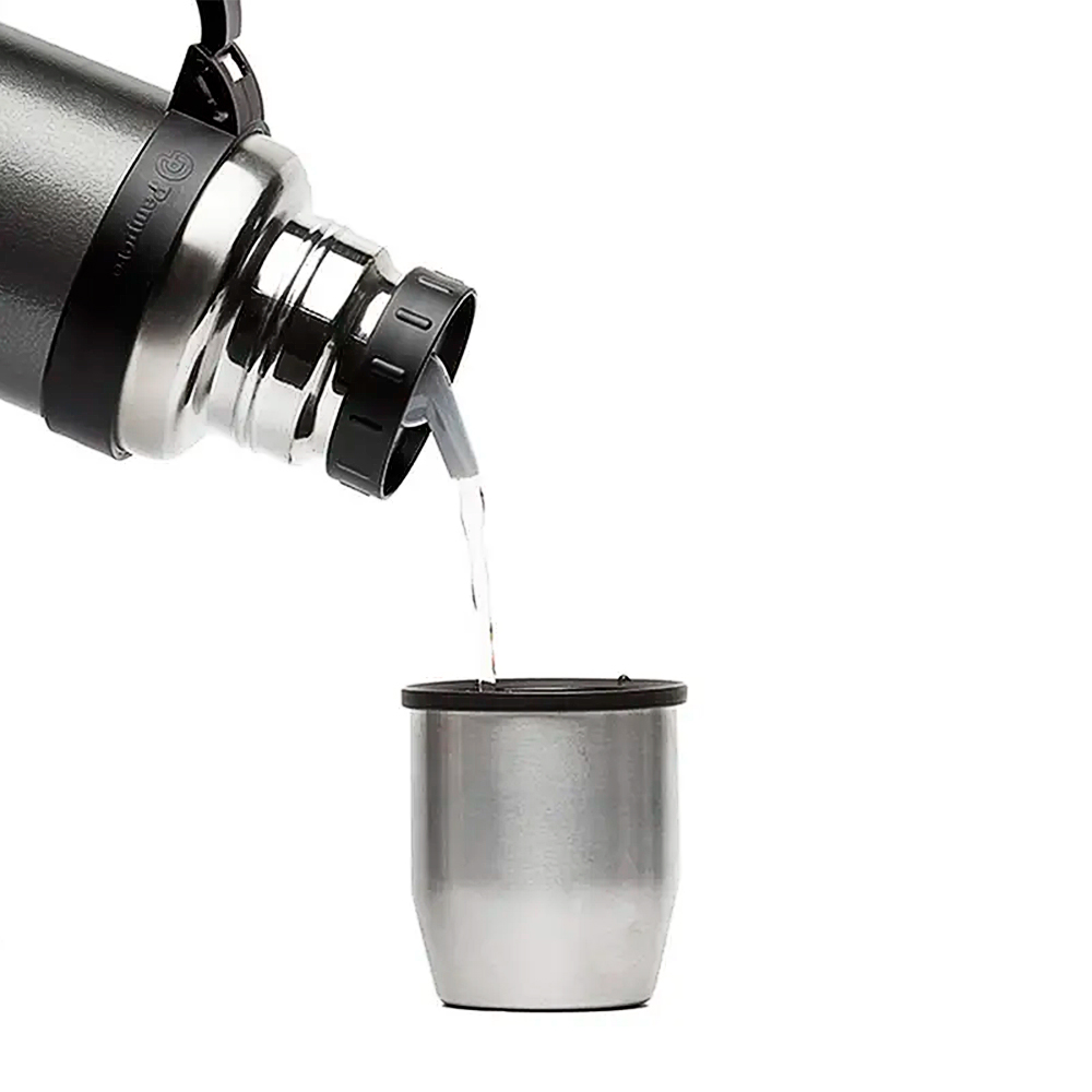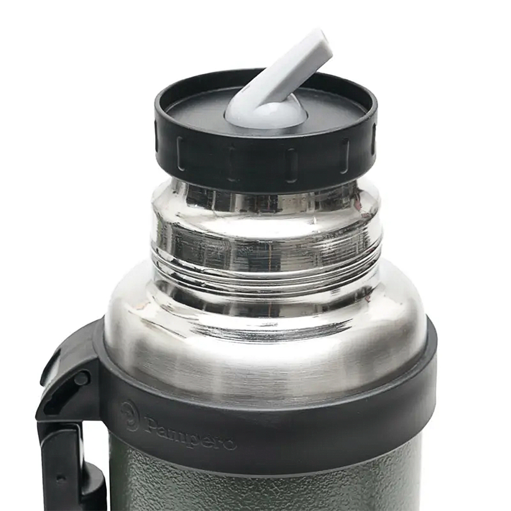 Cuenta con un tapón cebador hermético a rosca con sistema antiderrame, además de una tapa multifunción con superficie plana y estable que puede utilizarse como taza o vaso. Incorpora una manija plegable que facilita el transporte, lo que lo convierte en un termo funcional y elegante para oficina, viajes, actividades al aire libre o kits empresariales.