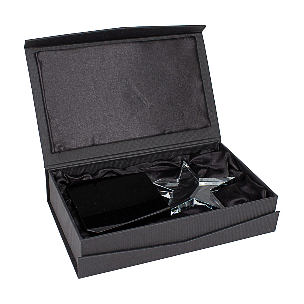 Este trofeo se presenta en una caja de cartón forrado negro con cierre imantado, con interior acolchado de espuma y tela poliéster satinado negro troquelado, asegurando una presentación premium y protección óptima. Su formato estilizado es perfecto para grabados personalizados, transformándolo en un galvano memorable y de alto impacto visual.