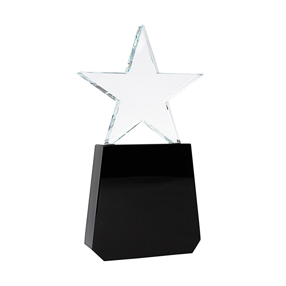 Es una pieza de reconocimiento corporativo elegante y moderna, ideal para premiaciones empresariales, eventos institucionales y ceremonias de alto prestigio. Su diseño destaca por una base de cristal negro que aporta solidez visual y una estrella de cristal en la parte superior, símbolo de excelencia, logro y liderazgo.