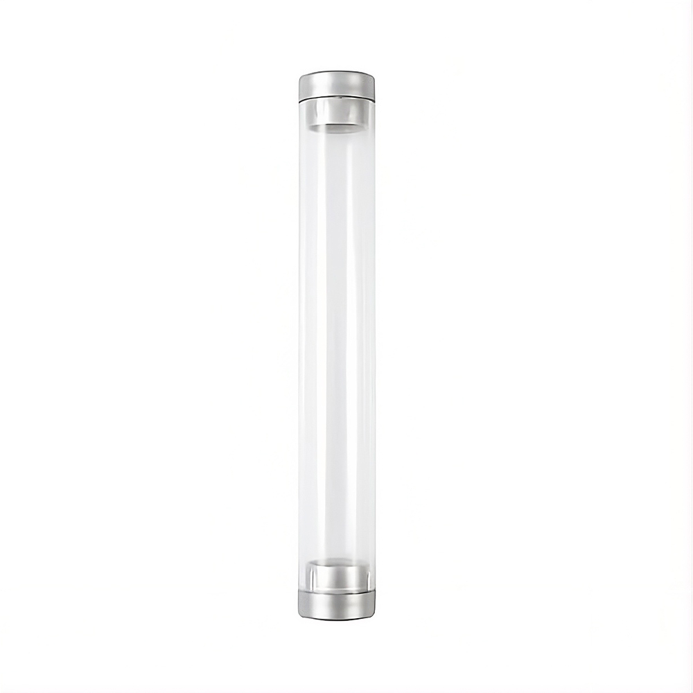 Tubo porta-lápiz traslúcido de acrílico con tapas plateadas, ideal para presentación de bolígrafos.